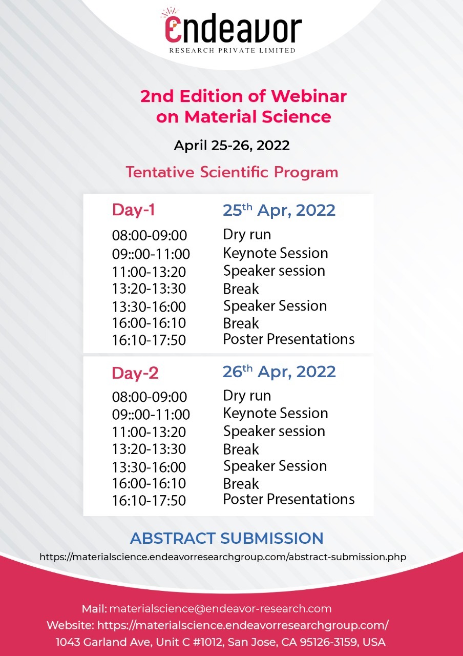After successfully completing the first edition of Material Science-2020 webinar, Endeavor Research private Limited is proudly announcing the "2nd Edition of Webinar on Material Science" which is going to be held on April 25-26, 2022.